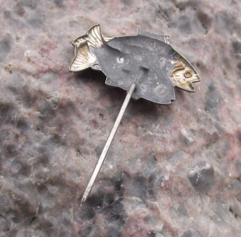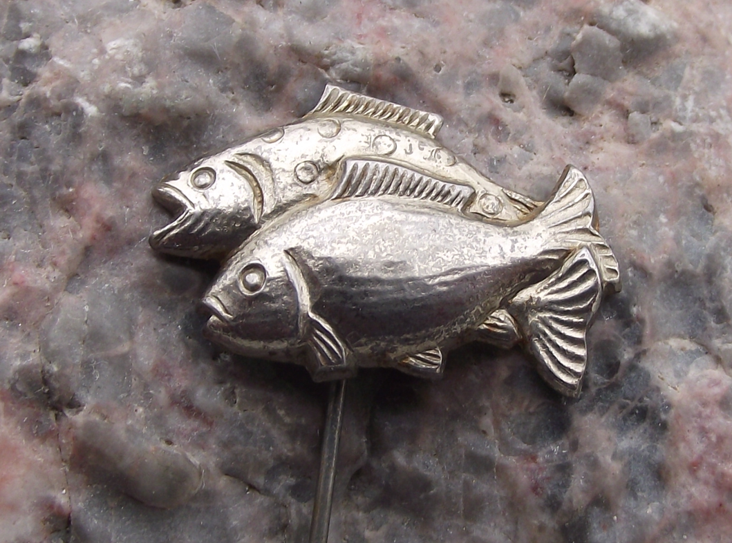 - The badge face is 2.2cm wide and has a long stick pin style fastener to the rear and features a pair of fish.