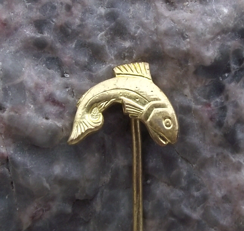 - A vintage gold coloured metal pin badge featuring a leaping trout.
