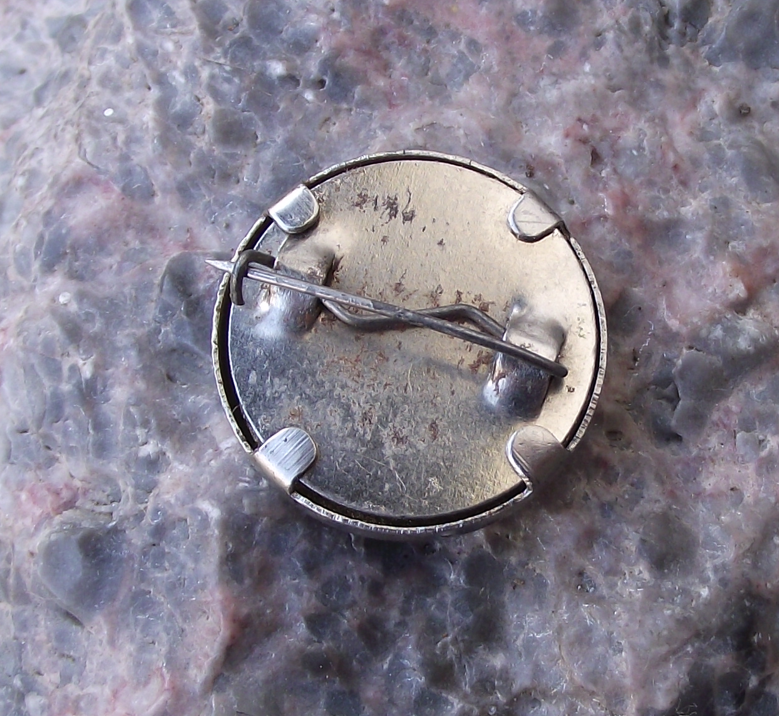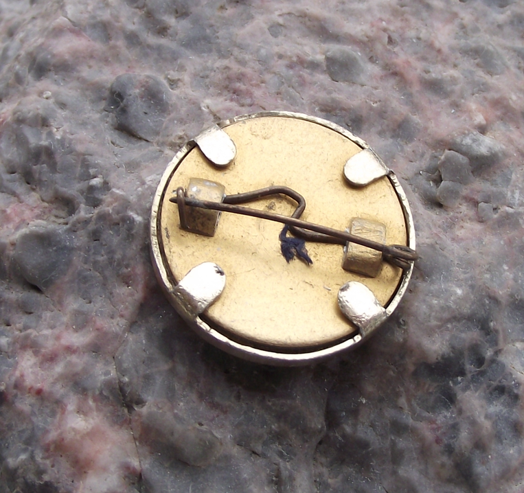 - A gold coloured, metal badge 1.9cm in diameter with a safety clasp style fastener to the rear.