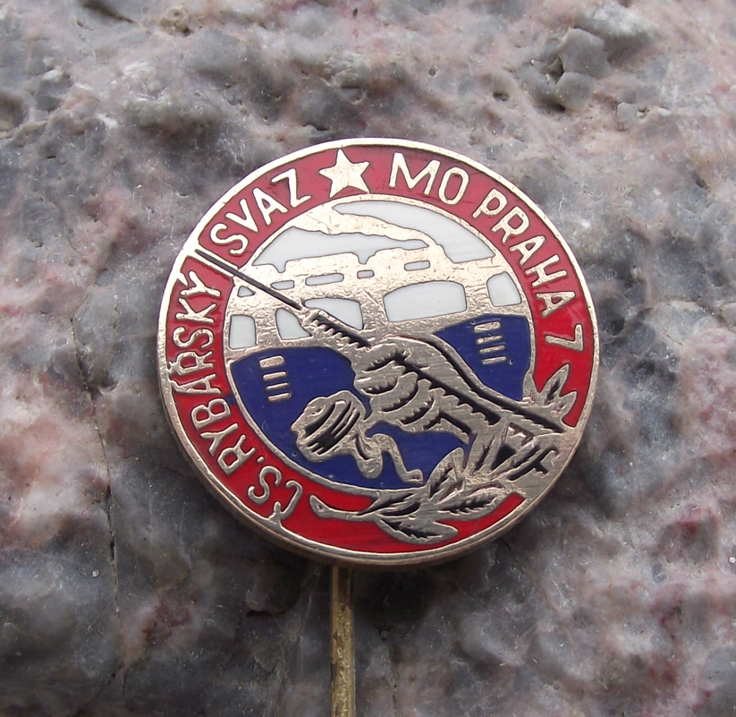 - A pretty, vintage gold coloured metal pin badge from the Prague 7 district in former Czechoslovakia. Denoting membership to the regional angling association.