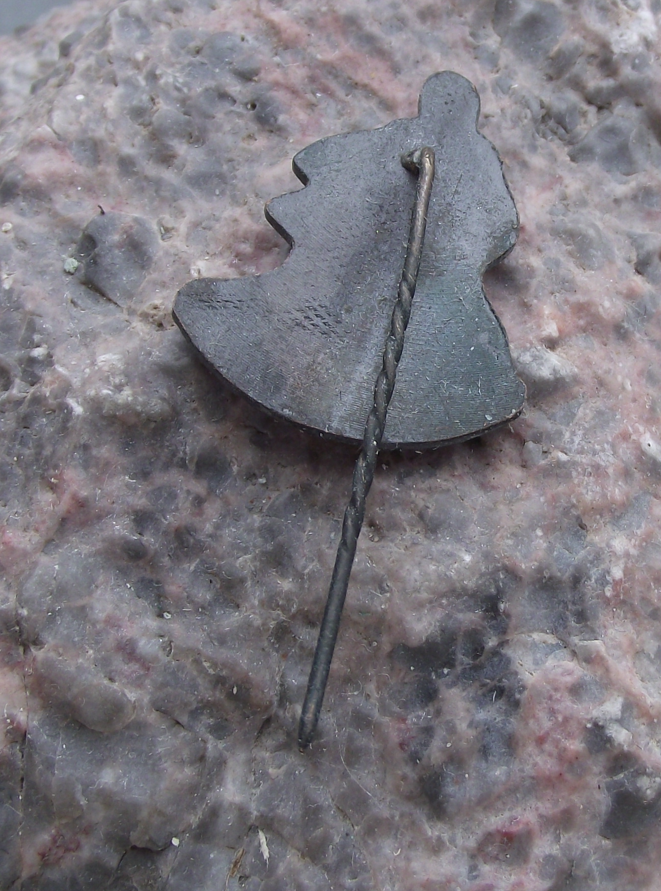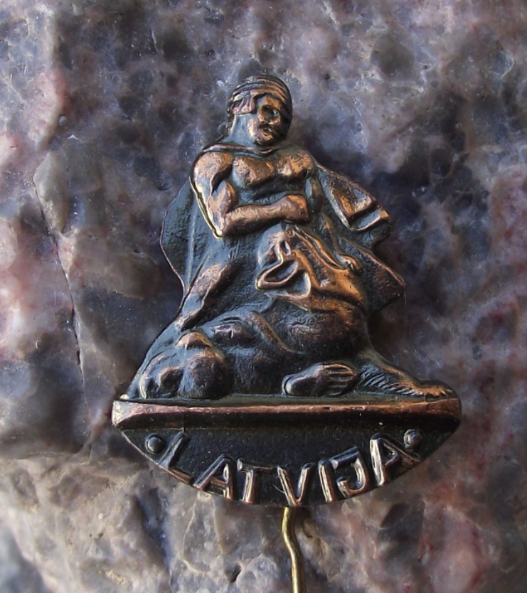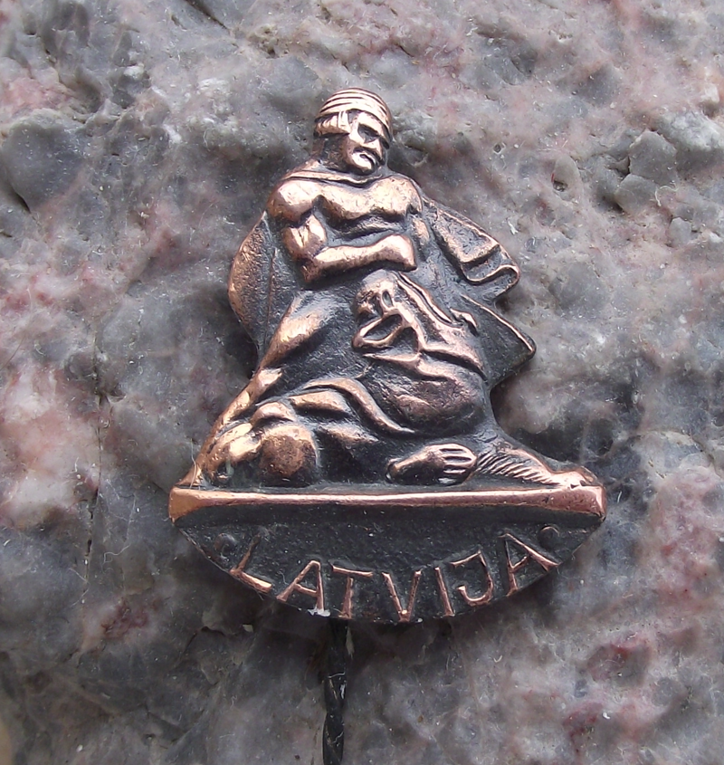 - A pretty bronze coloured metal pin badge from Latvia. Depicting the Baltic legend of Lacplesis who appears on the freedom monument in Riga. The badge face is 2.7cm high and it has a long, stick pin style fastener to the rear.
