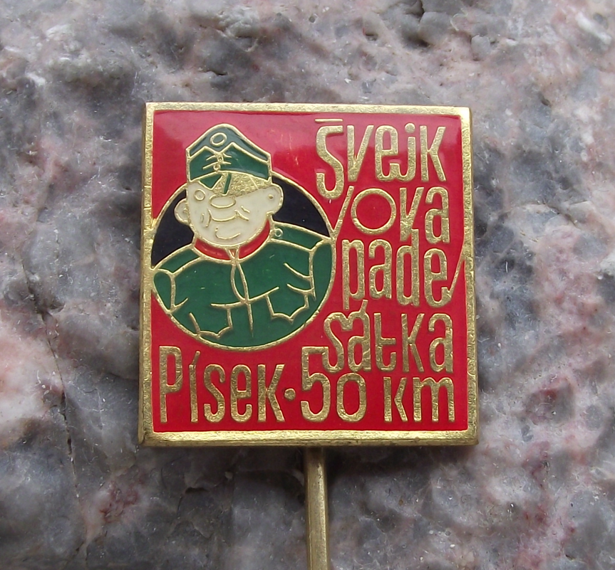 - A pretty gold coloured metal pin badge from former Czechoslovakia made in the 1980s with the likeness of Good Soldier Svejk and the text Svejkova Padesatka Pisek.