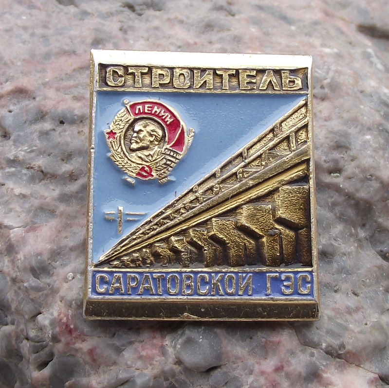 - The badge face features the text 'BUILDER Saratov GES' and was given to workers on the project in the 1970's