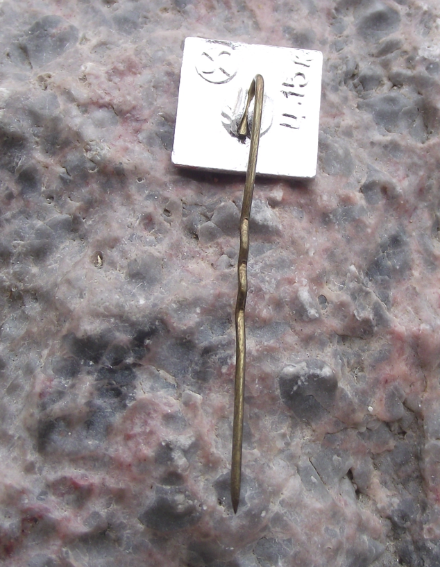 - A silver coloured, metal badge 1.2cm high with a long stick pin style fastener to the rear.