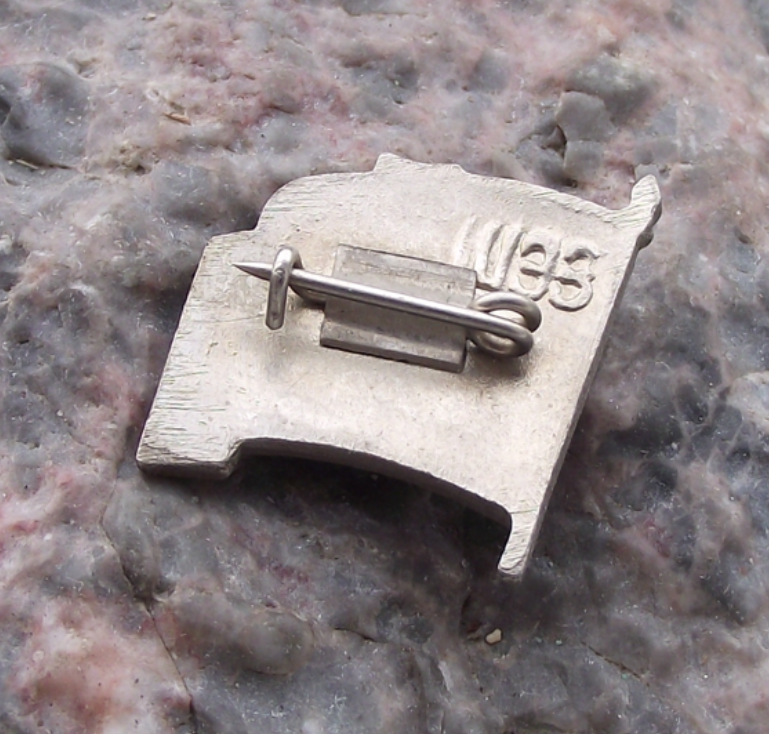 - A silver coloured, metal badge 1.7cm wide with a safety clasp style fastener to the rear.