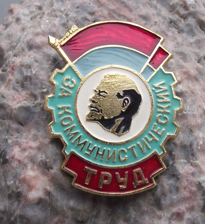 - The text reads 'За коммунистический труд' in Russian, which translates to 'FOR COMMUNIST LABOUR' and features the flag of Soviet Ukraine.