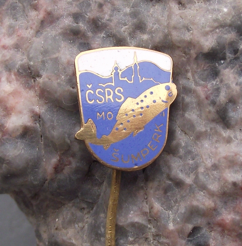 - A pretty, vintage gold coloured metal pin badge from Sumperk in former Czechoslovakia. Denoting membership to the regional angling association.