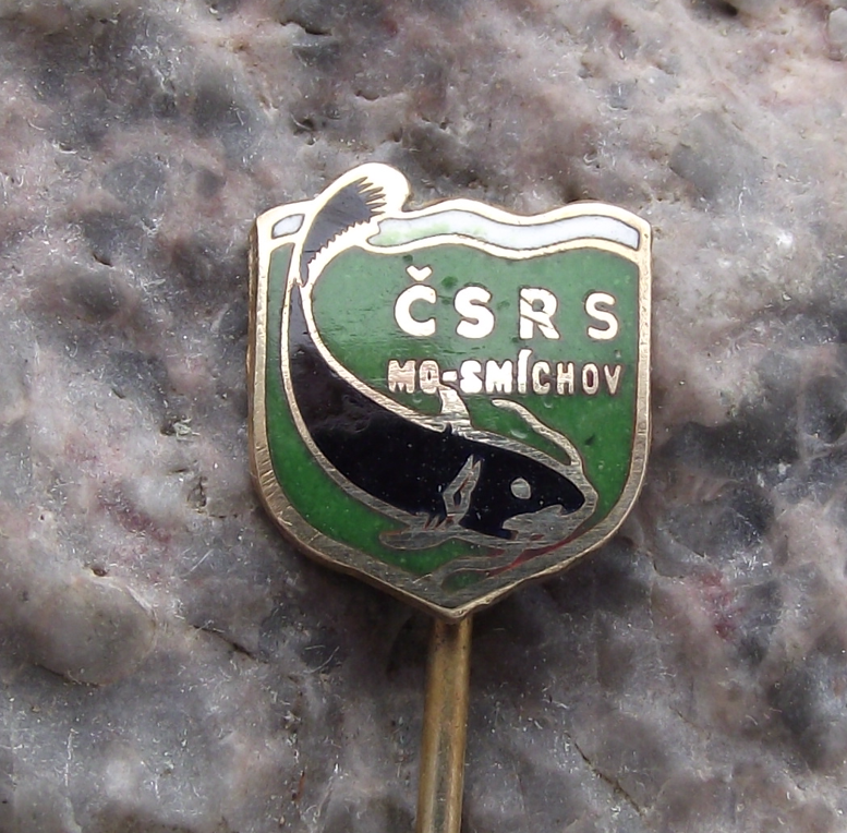 - A pretty, vintage gold coloured metal pin badge from the Smichov district of Prague in former Czechoslovakia. Denoting membership to the regional angling association.