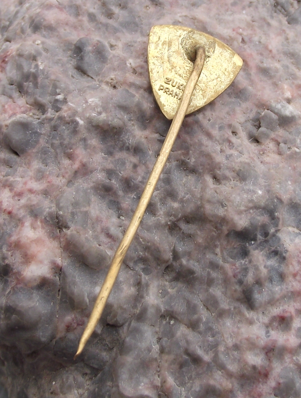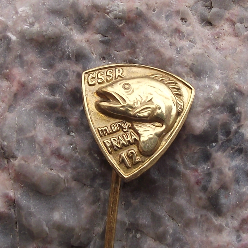 - A pretty, vintage gold coloured metal pin badge from Prague 12 in former Czechoslovakia. Worn by members of the local fishing association.
