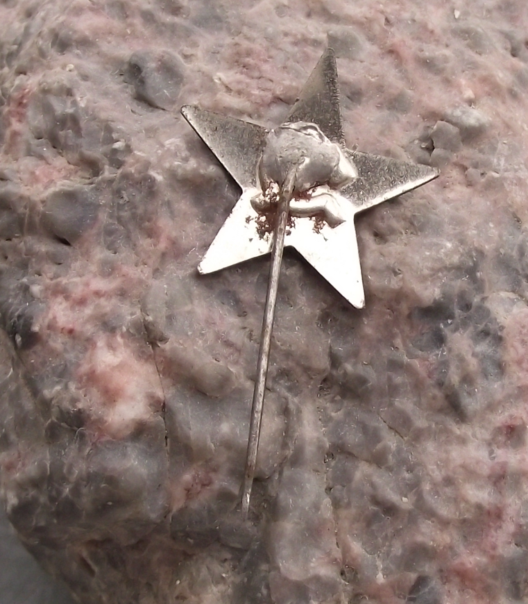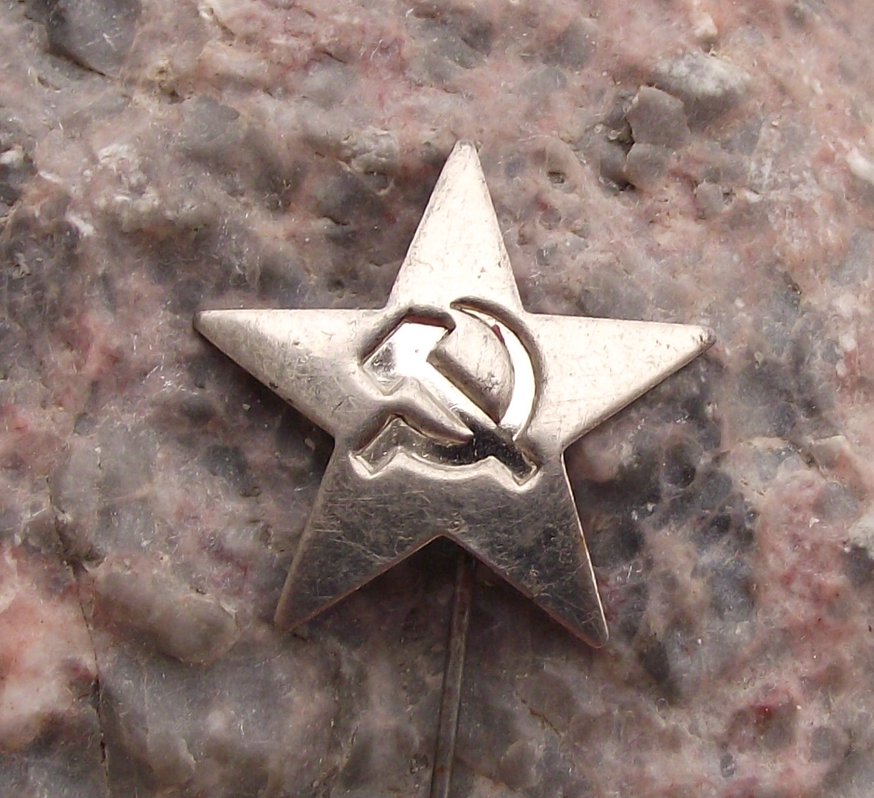 - A silver coloured, metal badge 2.2cm in diameter with a long stick pin fastener to the rear. Featuring the hammer and sickle logo of the former Soviet Union on a silver star.