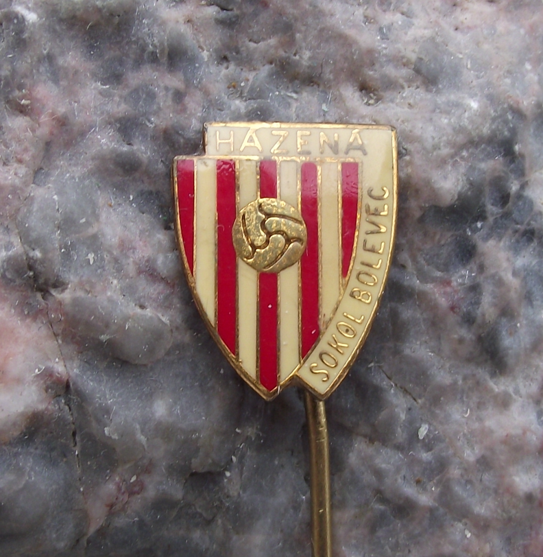 - A very pretty, vintage pin badge made in support of Sokol Bolevec handball in former Czechoslovakia. It is made from a gold coloured metal. The badge face is 1.4cm high and has a long, stick pin fastener to the rear.