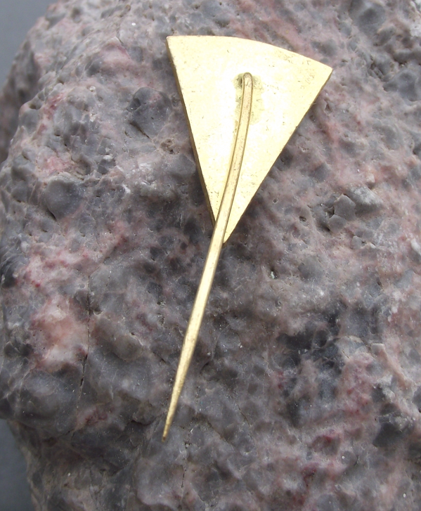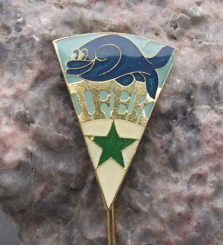 - A gold coloured pin badge, from the former Czechoslovakia Esperanto fish keepers association. The badge face is 2.9cm high and has a long, stick pin style fastener to the rear.