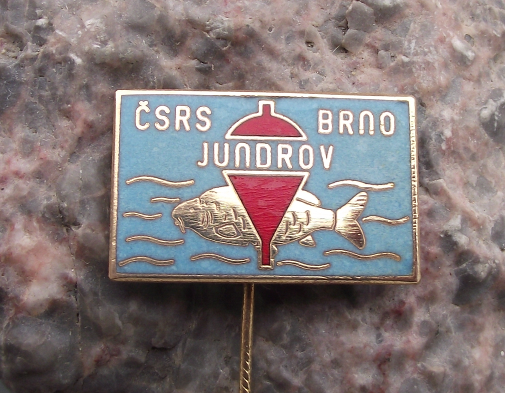 - The badge face is 2.5cm wide and has a long stick pin style fastener to the rear and features the text CSRS Brno Jundrov and depicts a carp and fishing float.