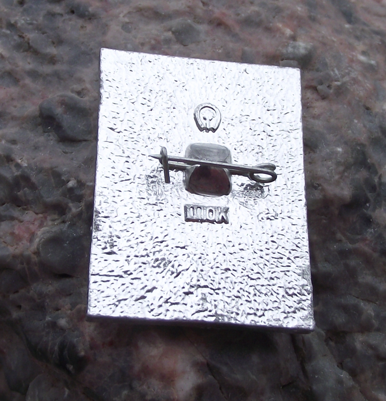 - A silver/gold coloured, metal badge 2.8cm high with a safety clasp style fastener to the rear.