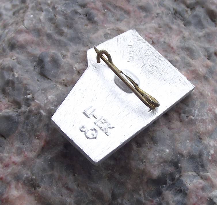- A silver coloured, metal badge 2.7cm high with a safety clasp style fastener to the rear.