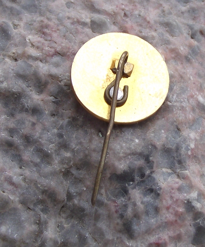 - A gold coloured, metal badge 1.7cm in diameter with a long, stick pin or clasp style fastener to the rear.
