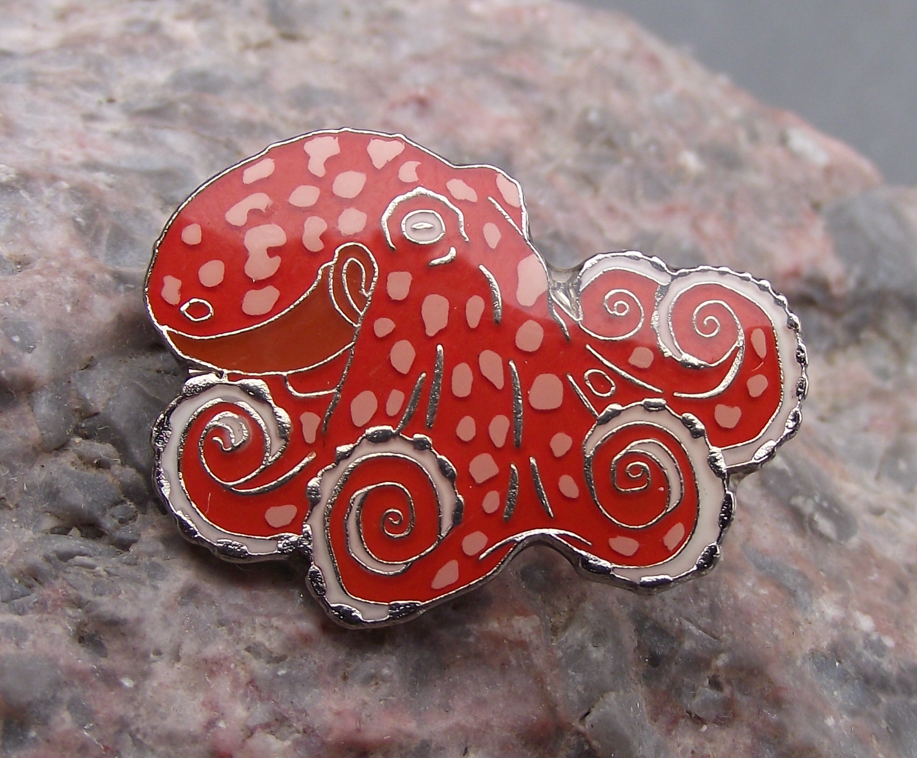- A pretty, wildlife pin badge featuring a curled octopus. The badge face is 2.5cm wide and has a modern butterfly clasp style fastener to the rear.
