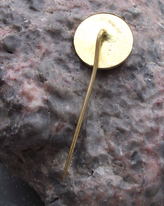 A vintage, gold coloured metal hunting themed pin from former Czechoslovakia, the badge face is 1.5cm in diameter and has a long, stick pin style fastener to the rear. Featuring the text 'South Moravian State Forests Worker Award.'