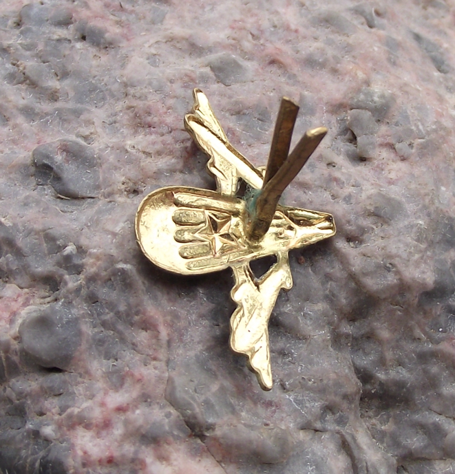 - A gold coloured metal insignia from the army of socialist Czechoslovakia the CSLA (Československá lidová armáda). The badge face is 2.6cm wide and has a pair of bendable tabs that secure it to material.