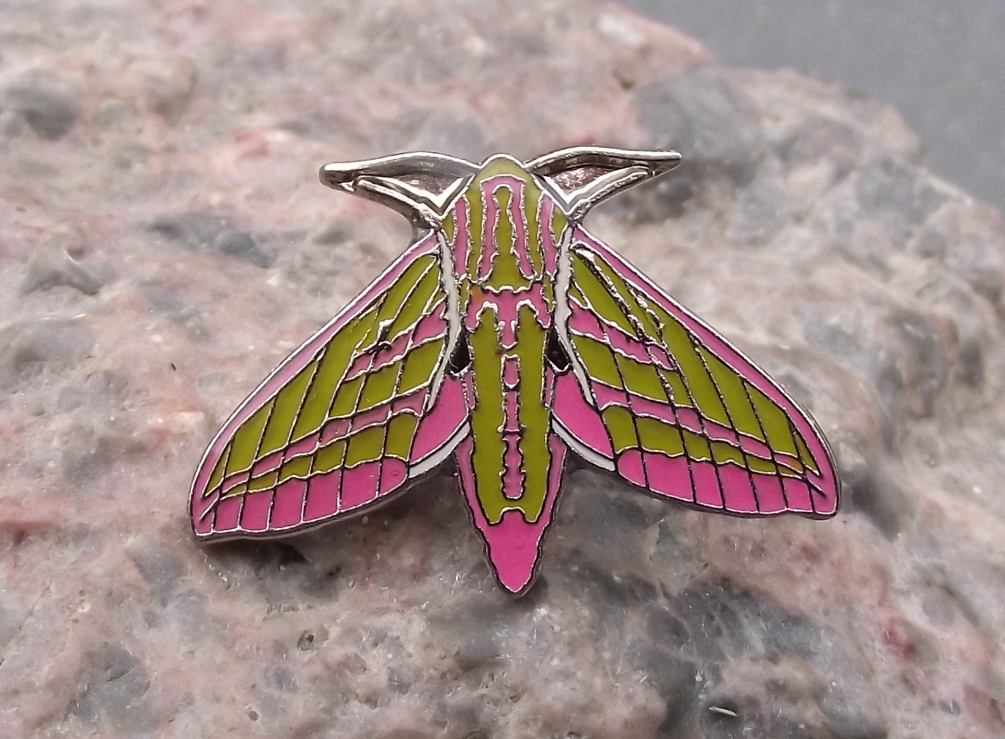 - A pretty, wildlife pin badge featuring a Elephant Hawk moth. The badge face is 2.7cm wide and has a modern butterfly clasp style fastener to the rear.