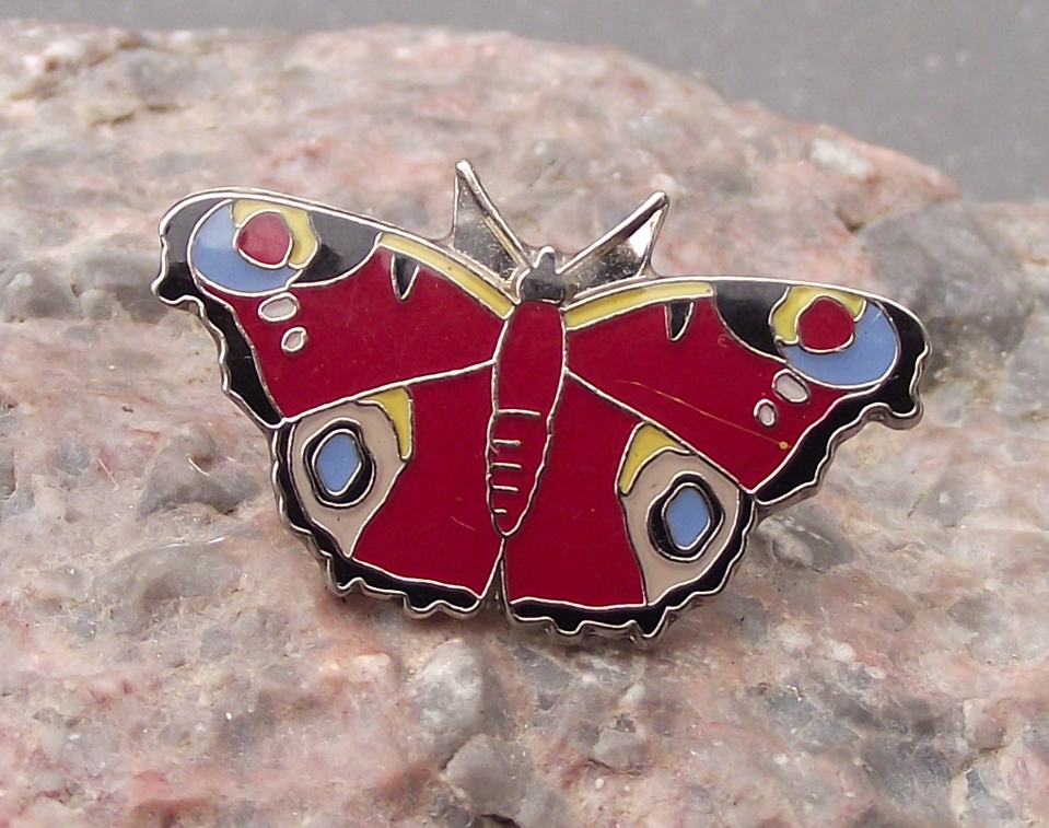 - A pretty, wildlife pin badge featuring the beautiful Aglais io or European Peacock species of butterfly.