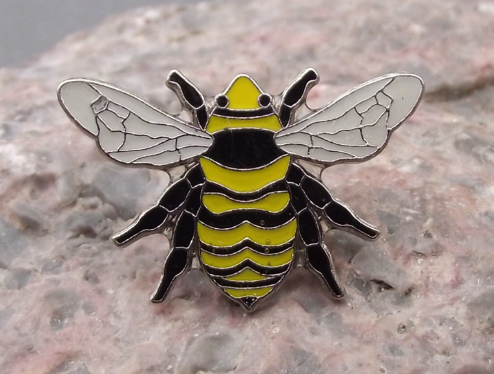 - A pretty, wildlife pin badge featuring a Bumblebee. The badge face is 2.6cm wide and has a modern butterfly clasp style fastener to the rear.
