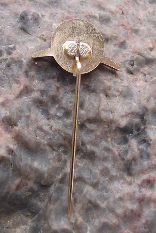 The pin on sale here is an AVIA logo pin, it is made from gold coloured metal. It has a stick pin fastener and is 2cm in diameter.