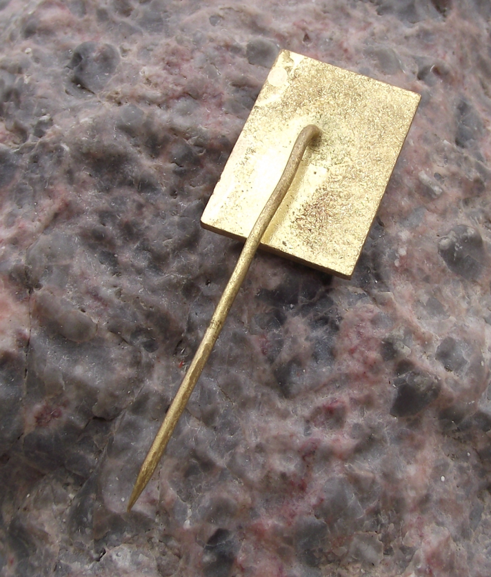 - A vintage pin badge, made from metal and with a 2cm high badge face. The rear side has a long, stick pin style fastener.