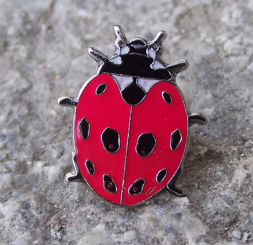- A pretty, wildlife pin badge featuring a Ladybug. The badge face is 1.7cm wide and has a modern butterfly clasp style fastener to the rear.