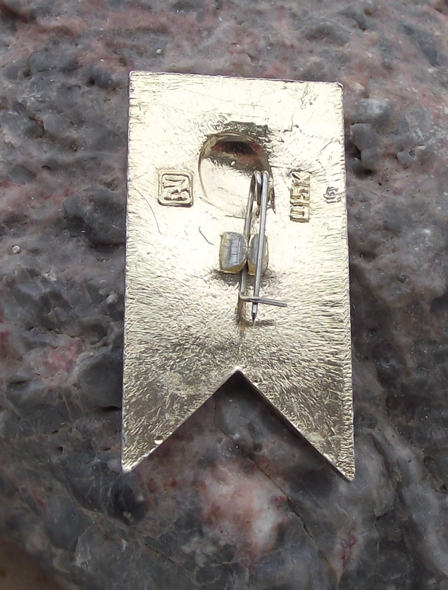 - A silver coloured, metal badge 3.3cm high with a safety clasp style fastener to the rear.