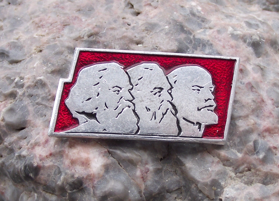 - A pretty pin badge, 3cm in diameter, made of a silver coloured metal and featuring Karl Marx, Friedrich Engels and Vladimir Lenin . With a safety clasp style fastener to the rear.