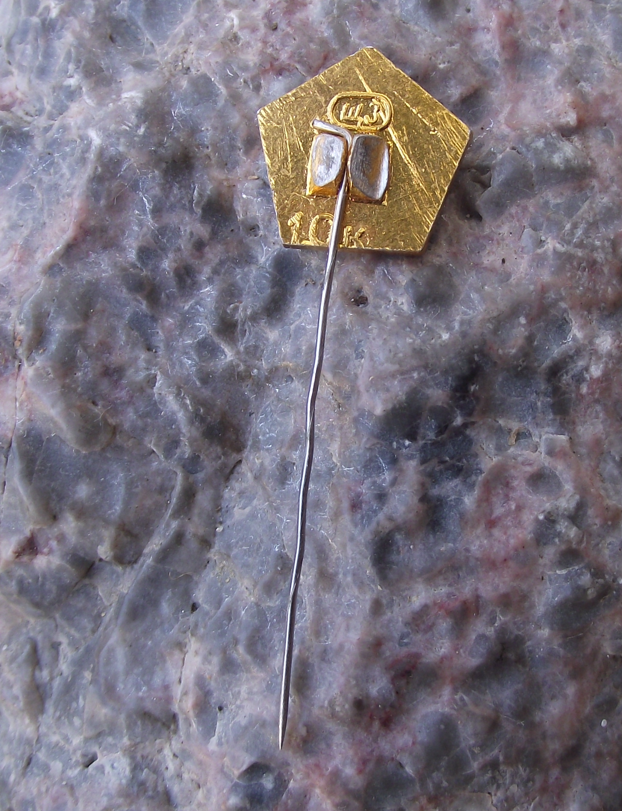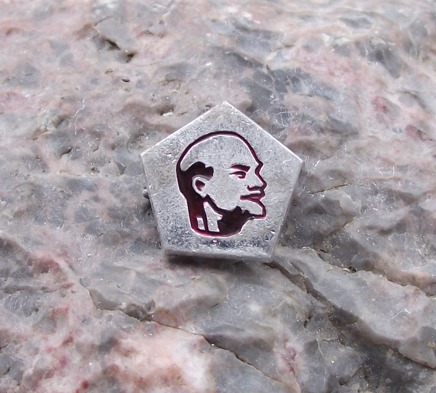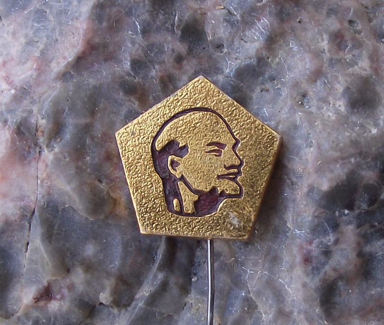 - A pretty (and small), Lenin pin badge, with a 1.4cm wide badge face, made of a silver or gold coloured metal and with a safety clasp or stick pin style fastener to the rear.