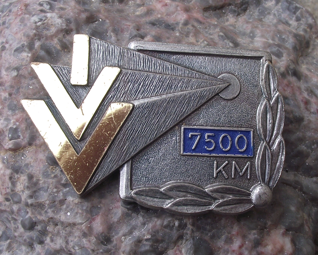 - A vintage silver coloured metal pin badge 5cm wide with a safety clasp style fastener to the rear. Awarded for completing 7500 kilometers.