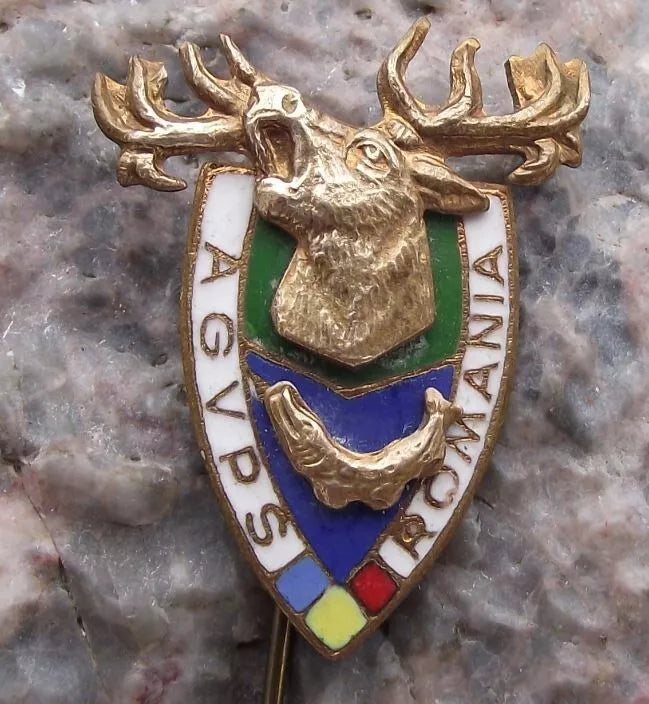A vintage, gold coloured metal pin badge from Romania, the badge face is 2.8cm high and has a long stick pin style fastener to the rear. It features an impressive deer stag and fish in 3D relief with the country flag and the initials AGVPS who are the National Romanian Association of Sport Fishing and Hunting.