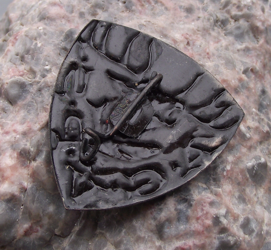 A vintage, dark coloured metal pin badge from Romania, the badge face is 3.6cm high and has a safety clasp style fastener to the rear. It features an impressive deer stag above a fish and the initials AGVPS who are the National Romanian Association of Sport Fishing and Hunting.