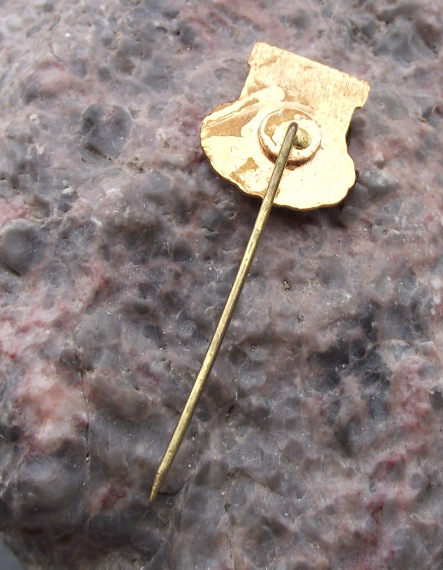 A vintage, gold coloured metal pin badge from Romania, the badge face is 1.8cm high and has a long stick pin style fastener to the rear. It features an impressive deer stag in 3D relief with the country flag and the initials AGVPS who are the National Romanian Association of Sport Fishing and Hunting.