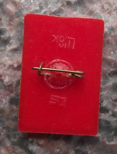 - A pretty red coloured plastic badge with a 2.7cm high badge face and a safety clasp style fastener to the rear.