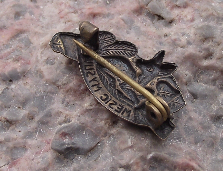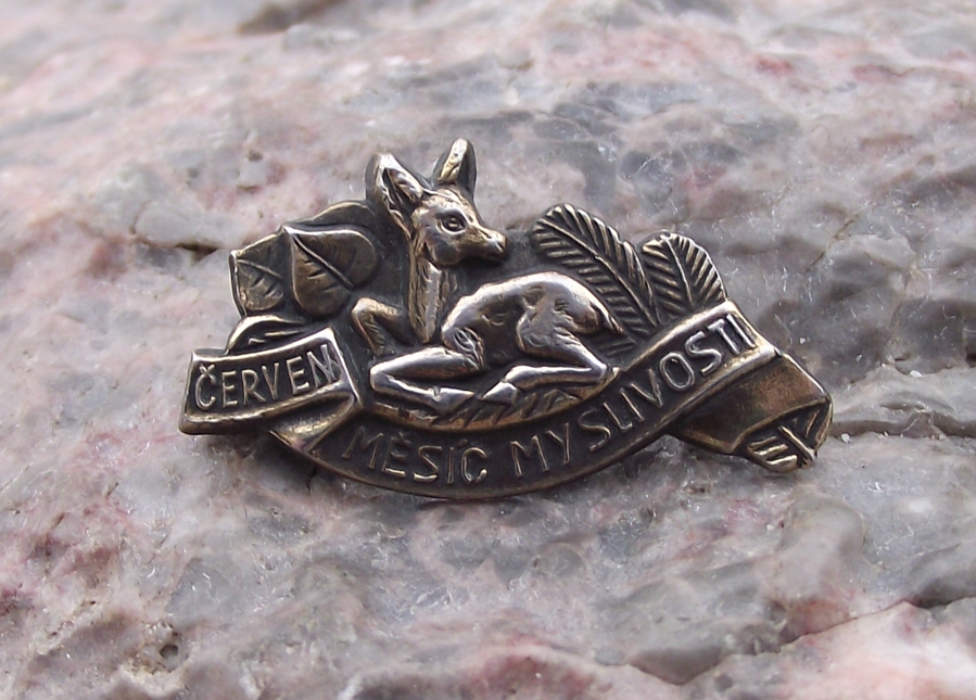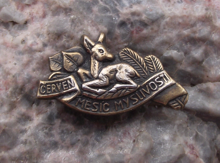 - A dark gold coloured metal hunting themed pin from former Czechoslovakia, the badge face is 2.5cm wide and has a safety clasp style fastener to the rear. Featuring the text 'June Hunter's Month', which is when hunting can take place again after the birth of the young deer.