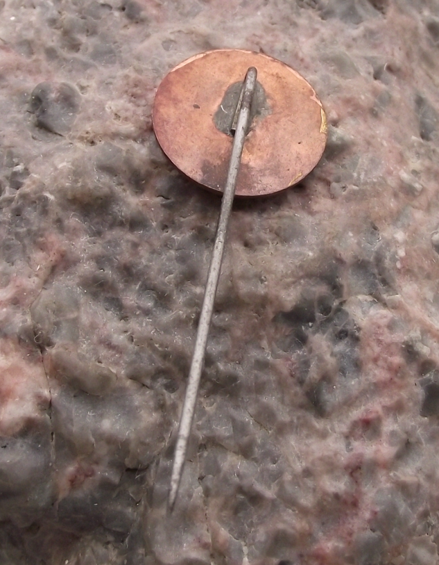 The badge face is 1.6cm high and has a long, stick pin style fastener to the rear.