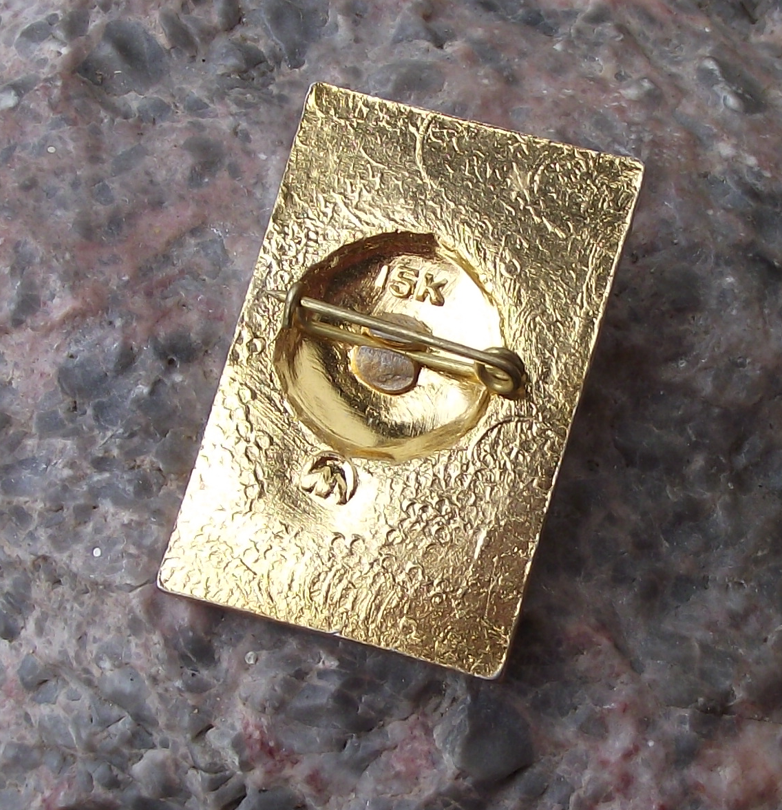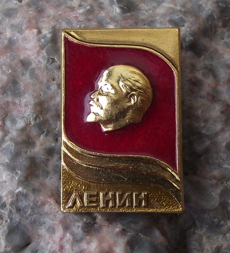 - A Lenin pin badge, 3.2cm high, made of a gold coloured metal and featuring Lenin's head on a red flag with the text LENIN below.
