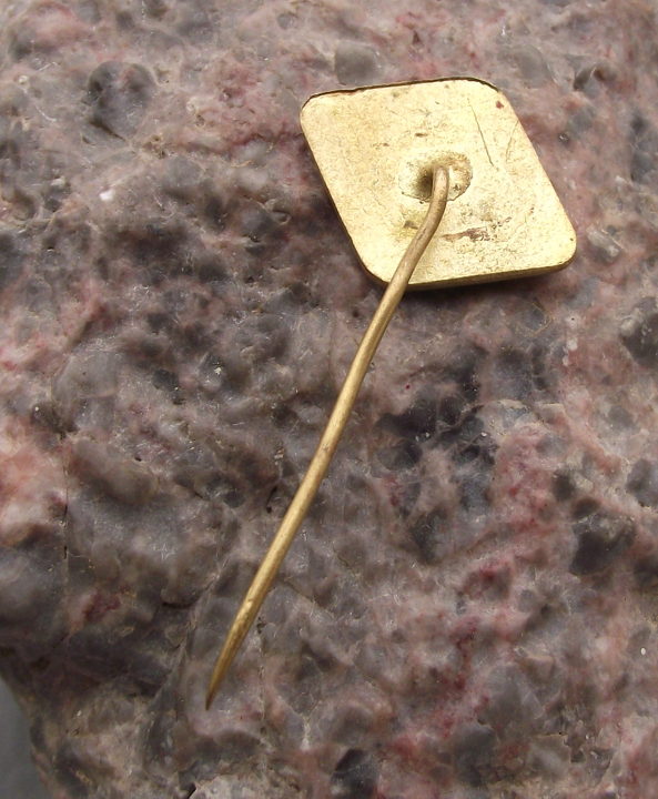 A pretty souvenir pin badge from the Slovak Railway Company. The badge face is 2.2cm wide, made from a gold coloured metal and has a stick pin fastener to the rear.
