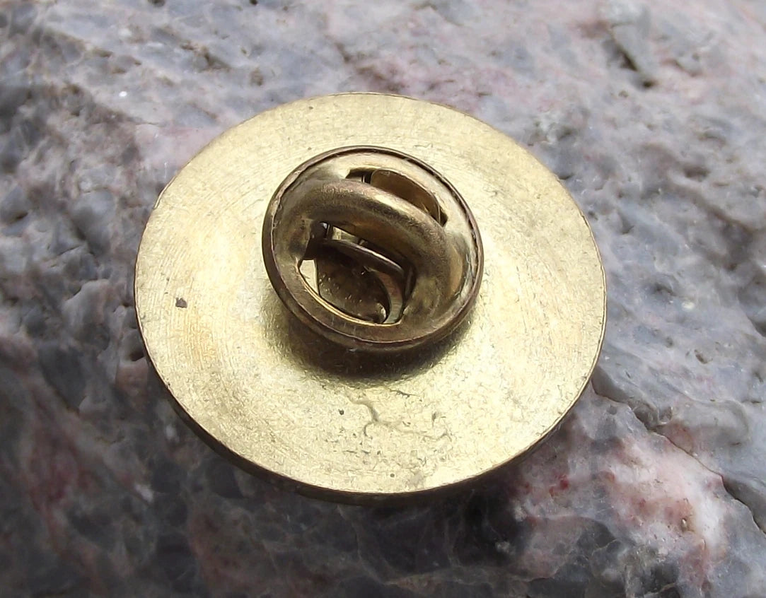 - A pretty pin badge made from a gold coloured metal. The badge face is 2.6cm in diameter and has a safety clasp style fastener to the rear. Featuring the Calgary beaver with a hockey stick.