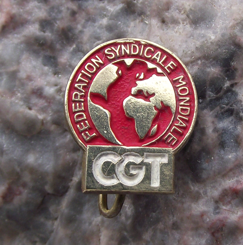 - The text on the badge face reads 'CGT Federation Sydicale Mondiale' and is from the French Workers' General Union and part of the FSM
