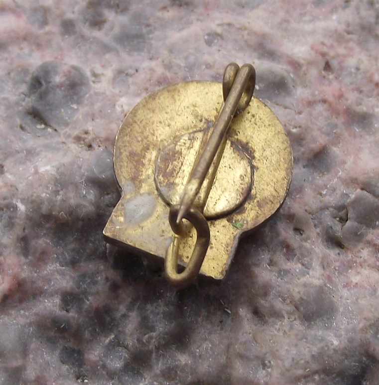 - A gold coloured metal pin badge with a 1.7cm high badge face and a safety clasp style fastener to the rear.