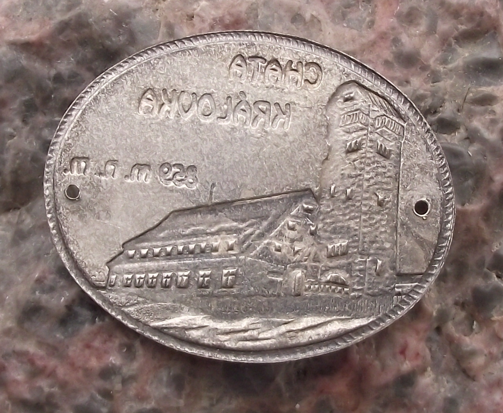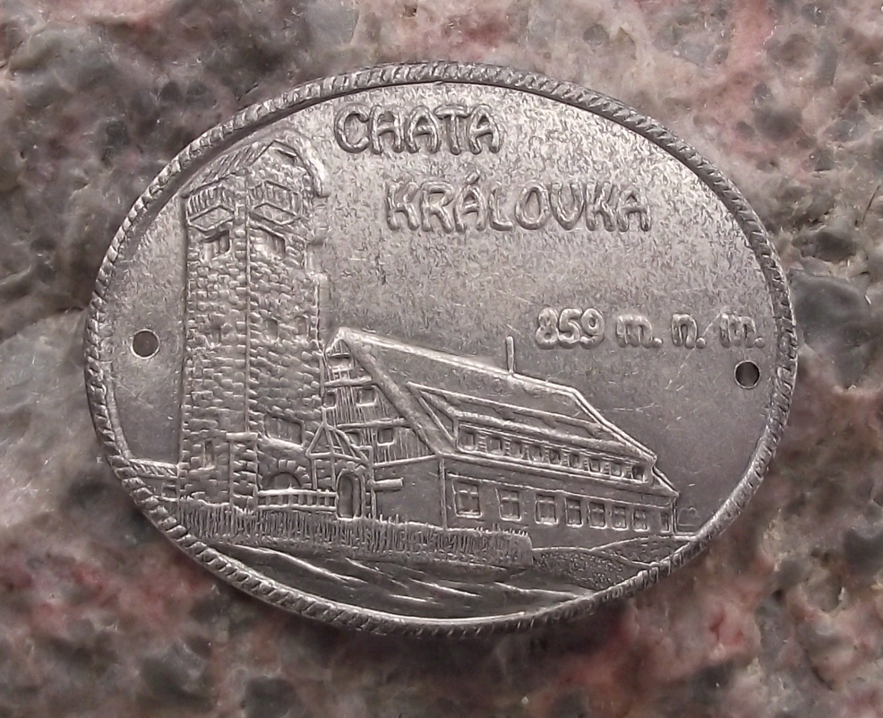- A vintage silver coloured metal walking stick plate, 4cm wide and depicting Chata Kralovka, a mountain view tower and lodge built in 1934