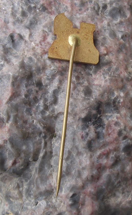 A gold coloured metal badge with a 1.6cm wide face and a long stick pin style fastener to the rear.