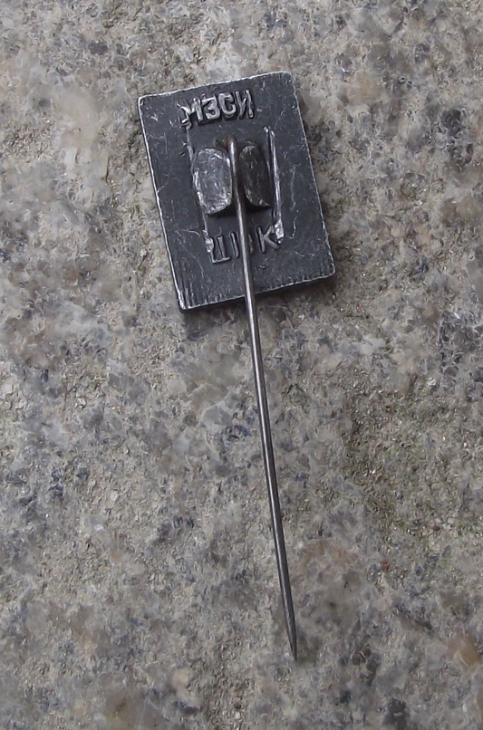 A silver coloured metal badge with a 1.2cm high face and a long stick pin style fastener to the rear.