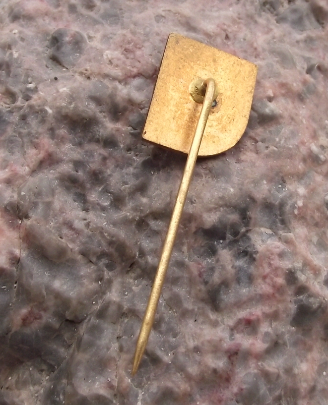 A vintage gold coloured metal hunting themed pin from former Czechoslovakia, the badge face is 1.6cm high and has a long, stick pin style fastener to the rear. Featuring the text OV CMS Klatovy', it would have been worn by members of the 'Cesky Myslivecky Svaz', (CMS) in Klatovy.