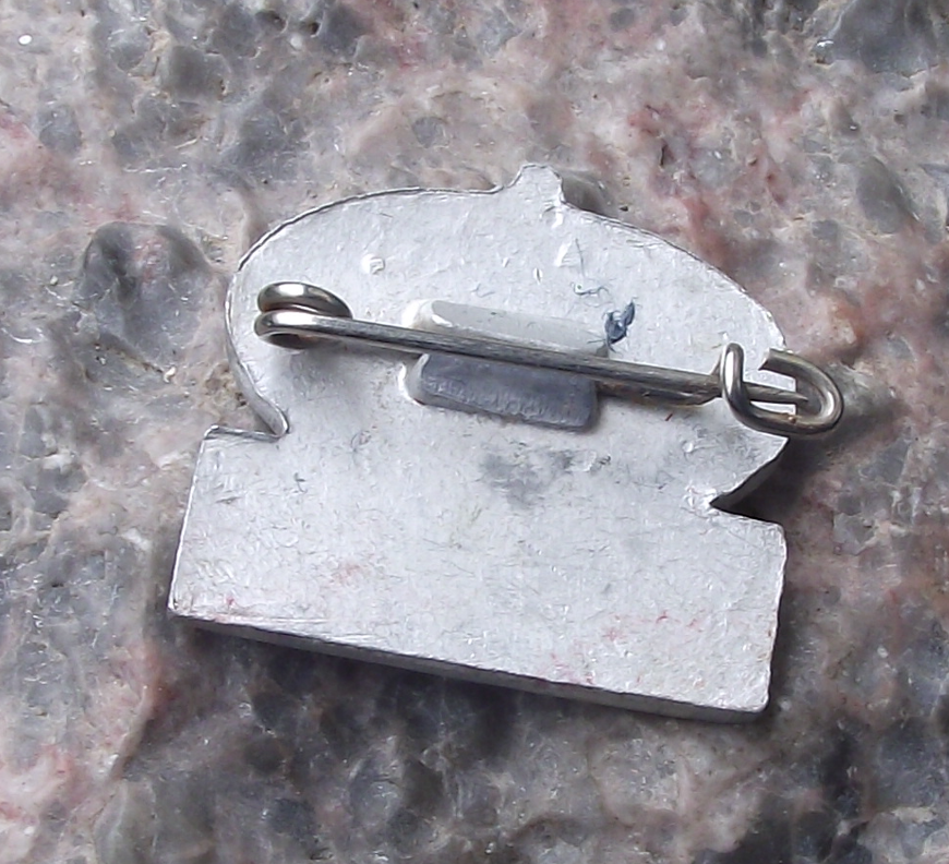 - A pretty silver coloured metal badge with a 2.2cm wide badge face and a safety clasp style fastener to the rear.