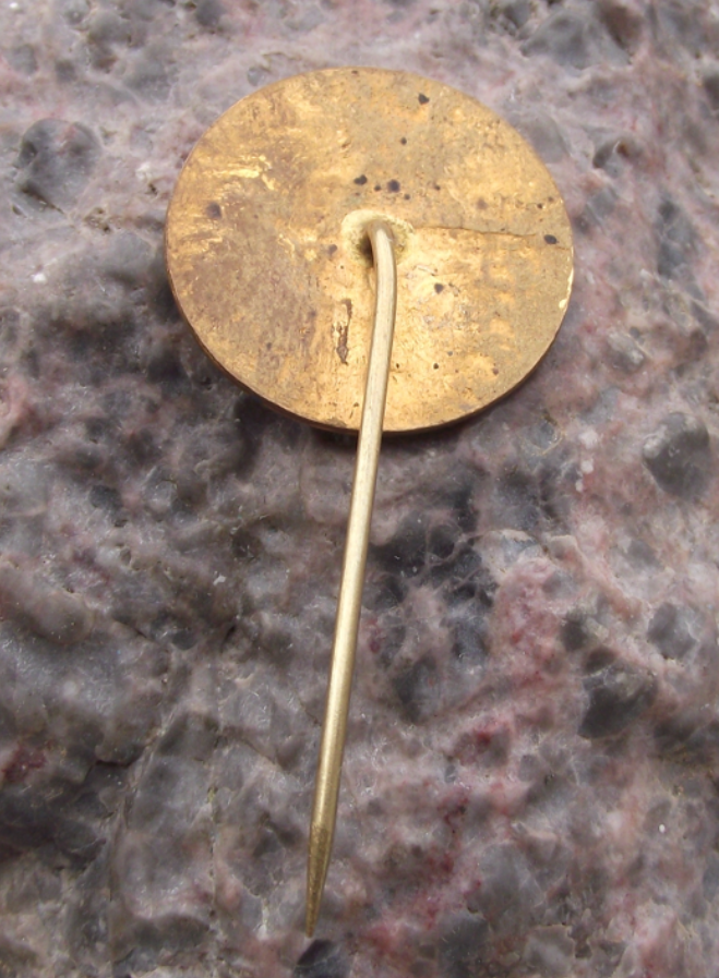 The badge face is 2.5 cm wide and has a long, stick pin style fastener to the rear.